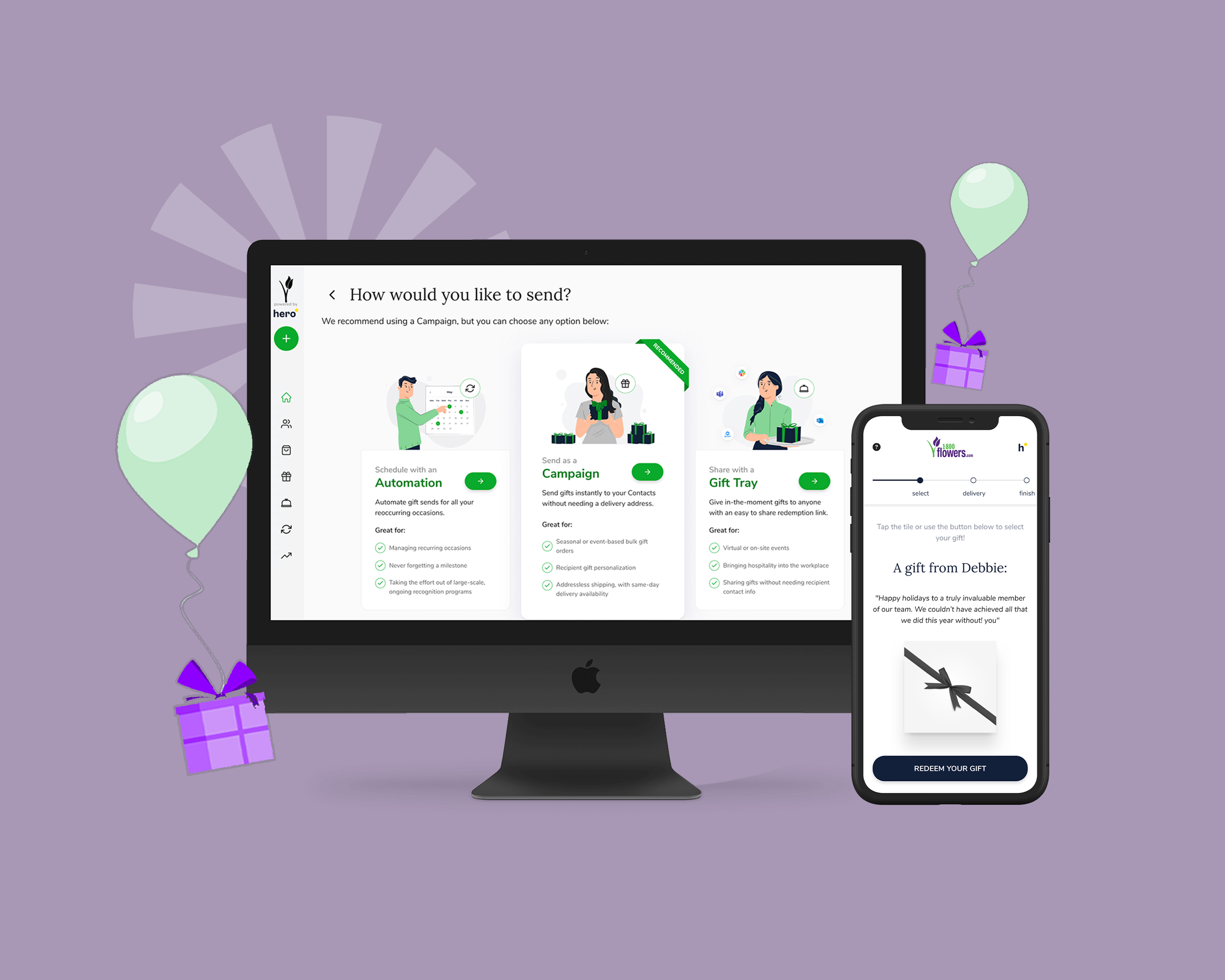 A computer and a smartphone showing the corporate gifting experience using 1-800-Flowers.com and SmartGift