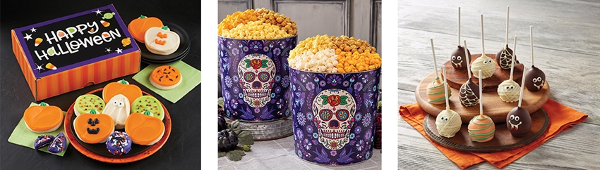 From monster mash and Day of the Dead popcorn tins to pumpkin-shaped buttercream cookies and scream-worthy cake pops, these Spooktacular gifts are sure to make All Hallows’ Eve hauntingly fun.